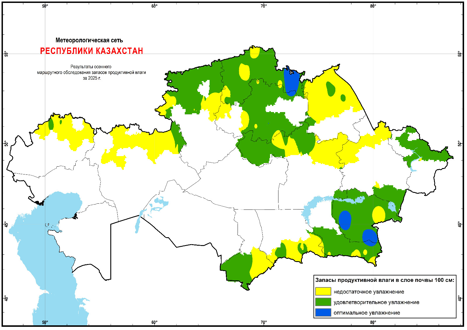 According to the results of a route survey conducted in October-November 2025, soil moisture reserves are satisfactory and optimal in most of the Akmola, Kostanay and North Kazakhstan regions. The formation of moisture reserves in these regions is due to precipitation in October and a decrease in the intensity of evaporation in the autumn season.