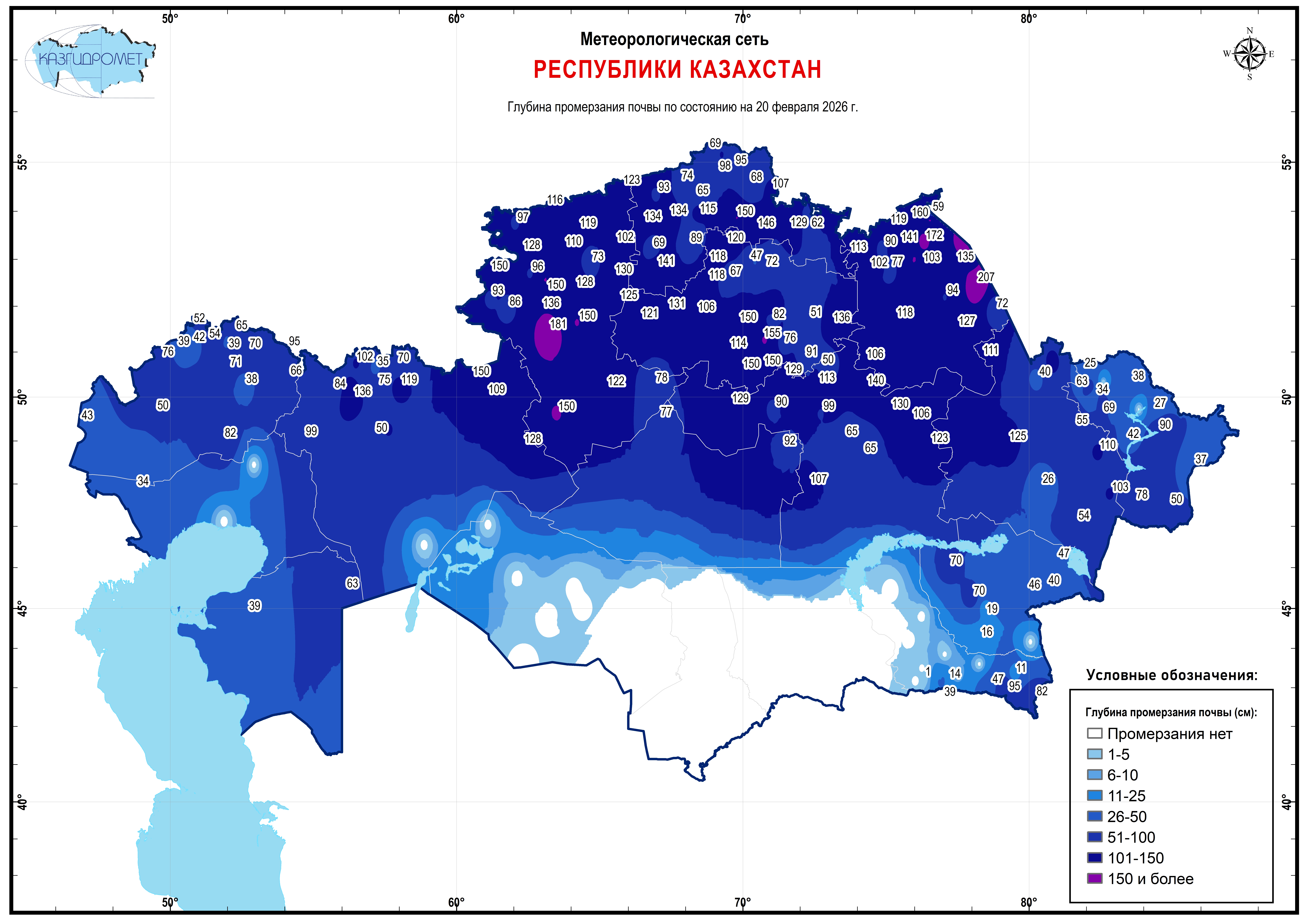 2026 жылғы 20 ақпандағы жағдай бойынша еліміздің басым бөлігінде топырақтың қатуы байқалады, ал оңтүстікте топырақ жібіген. Қатудың әлсіреуі оңтүстік-батыс және оңтүстік-шығыс өңірлерінде, сондай-ақ батыс, шығыс және орталықтың жекелеген аудандарында тіркелді.